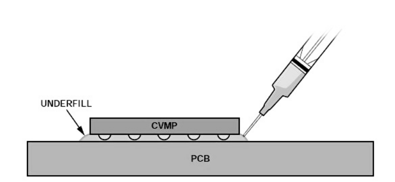 底部填充膠簡單來說就是底部填充之義,常規(guī)定義是一種用化學(xué)膠水(主要成份是環(huán)氧樹脂)對BGA 封裝模式的芯片進(jìn)行底部填充,利用加熱的固化形式,將BGA 底部空隙大面積 (一般覆蓋一般覆80%以上)填滿,從而達(dá)到加固的目的,增強(qiáng)BGA 封裝模式的芯片和PCBA 之間的抗跌落性能。底部填充膠還有一些非常規(guī)用法,是利用一些瞬干膠或常溫固化形式膠水在BGA 封裝模式芯片的四周或者部分角落部分填滿,從而達(dá)到加固目的。